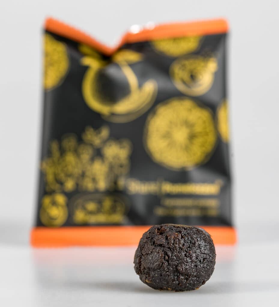 Auch wenn die Pomelozzini eine fermentierte Frucht ist, sie hat keinen seltsamen Geschmack! Im Gegenteil, sie schmeckt sehr angenehm, ähnlich wie eine Trockenpflaume, nur etwas fester und mit einem leicht zitronigen Geschmack.